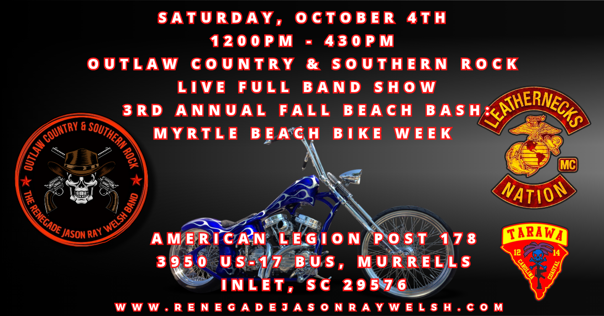 Featured October 4 @ 12:00 pm - 4:30 pm 3rd Annual Fall Beach Bash – Full Band – Fall Bike Rally American Legion post 178 3950 US-17 BUS, Murrells Inlet, SC, United States